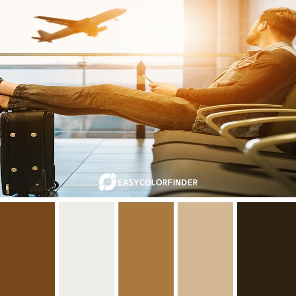Name: man sitting on gang chair with feet on luggage looking at airplane
